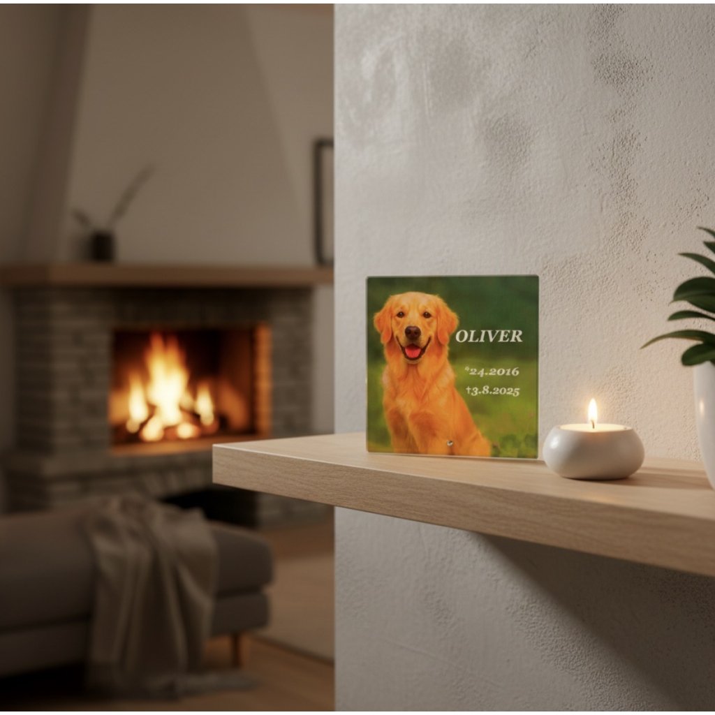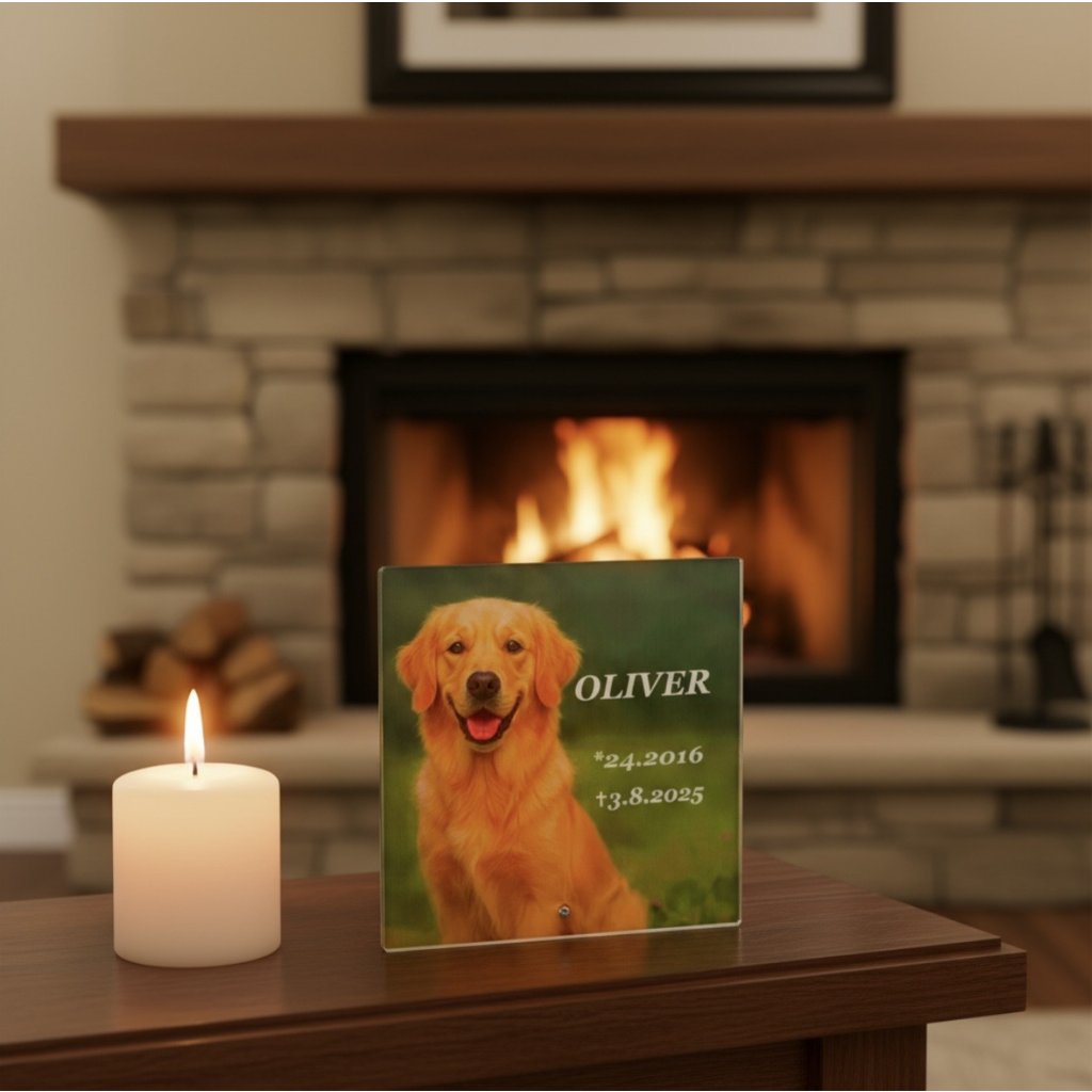 Skleněný interiérový pomníček 20×20 cm se stojánkem – pro domácí mazlíčky (pes, kočka) s fotografií